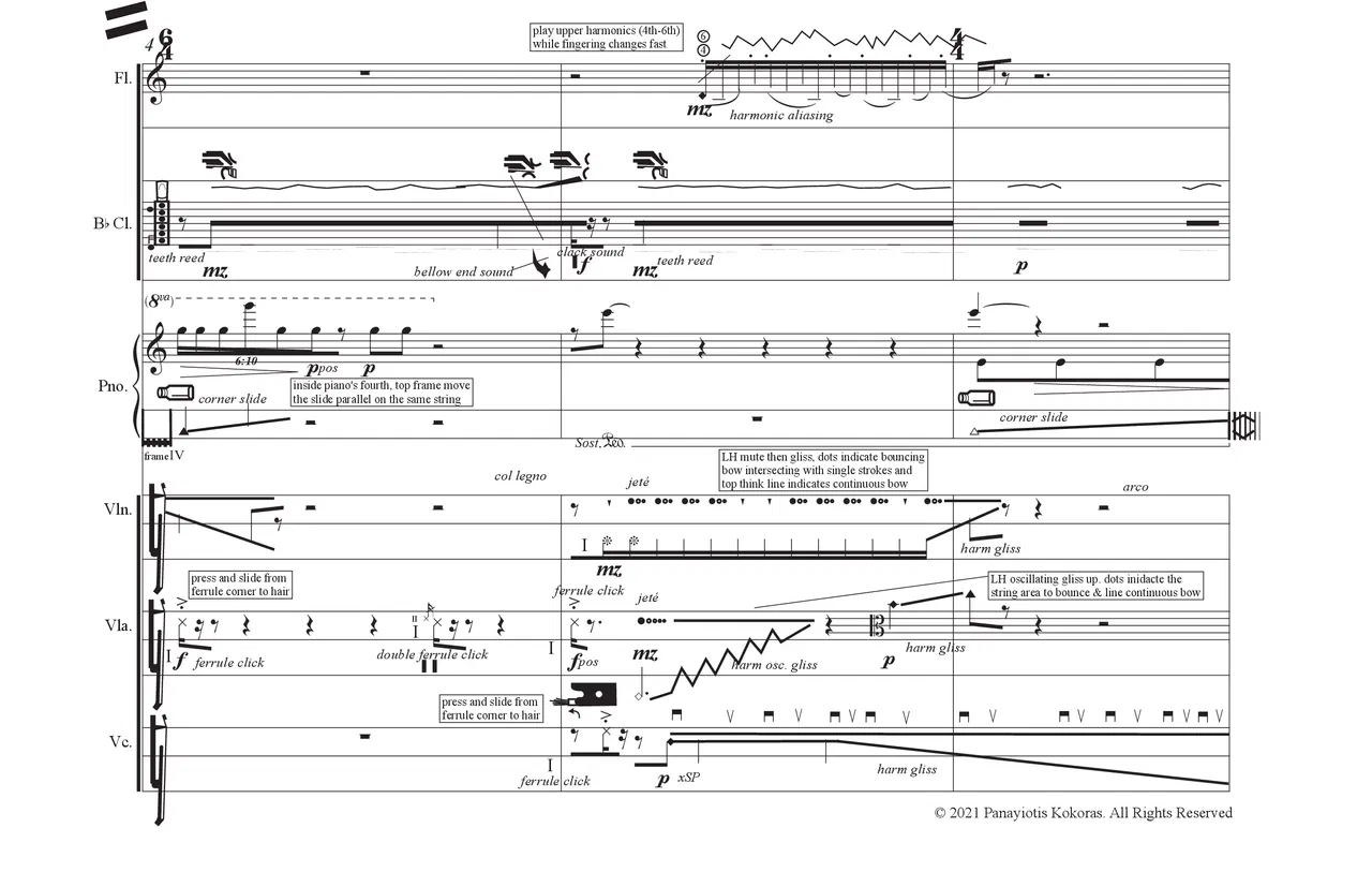 Demonic Animal was completed in Summer 2021 and commissioned by Synaesthesis Ensemble. The clarinet us played with a synthetic ultra-thin reed designed by the composer. The piece is inspired by Gilles Deleuze and Félix Guattari's writings—particularly, the essay "Becoming Animal" from a much longer work entitled A Thousand Plateaus: Capitalism and Schizophrenia. In this essay, the authors differentiate three different types of animals. The first type is the Oedipal animal, which is individualized and sentimentalized. The second type is the Jungian, or archetypal, animal, which has a symbolic presence in many human cultures' myths, rituals, and spiritual beliefs. The third type is the Demonic animal, which is unconscious, subtle, and fluid and operates on a micro level.